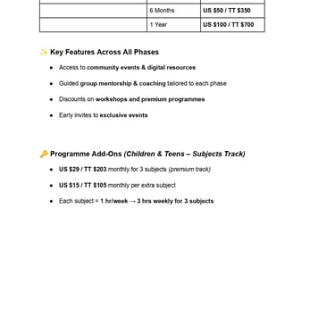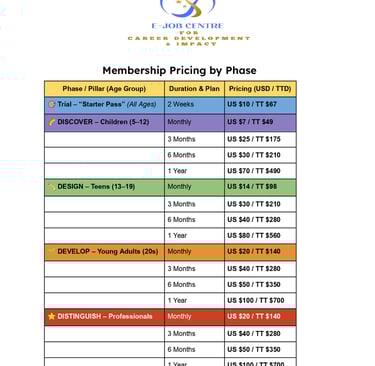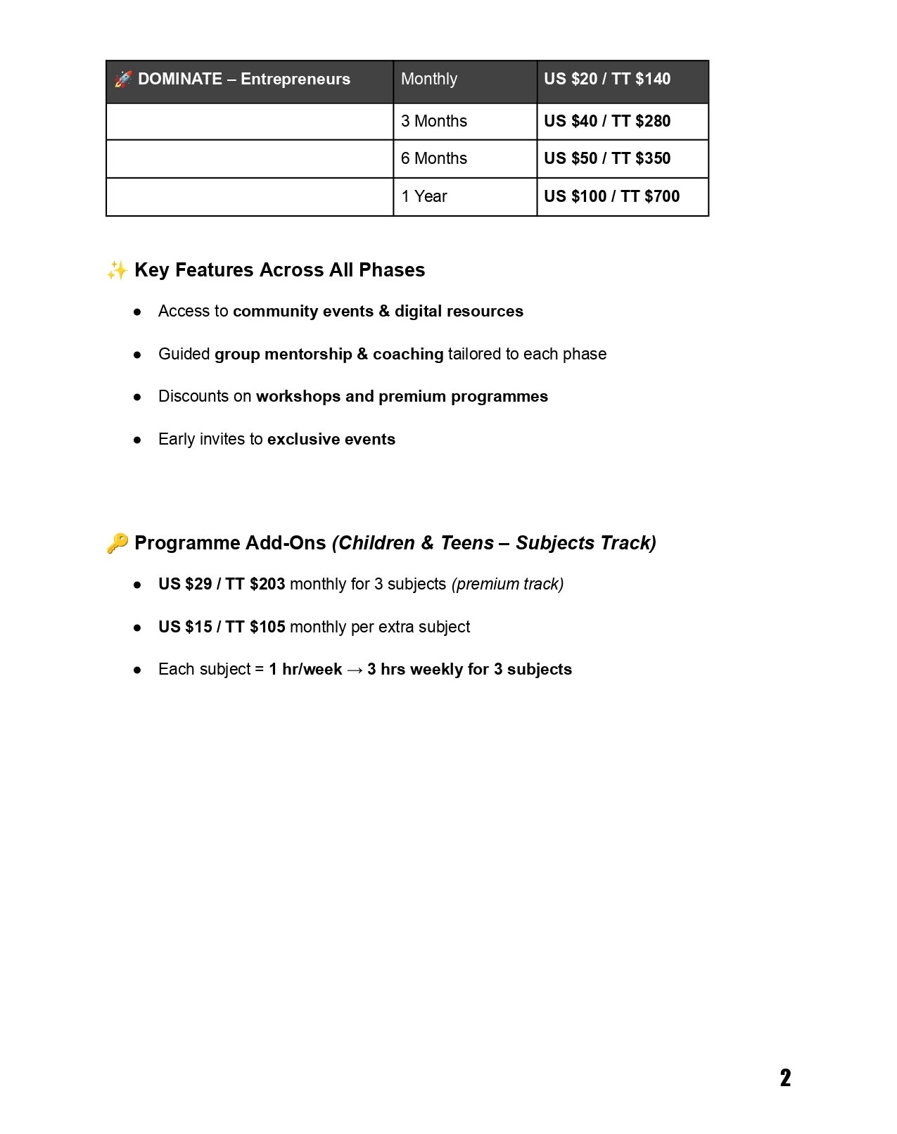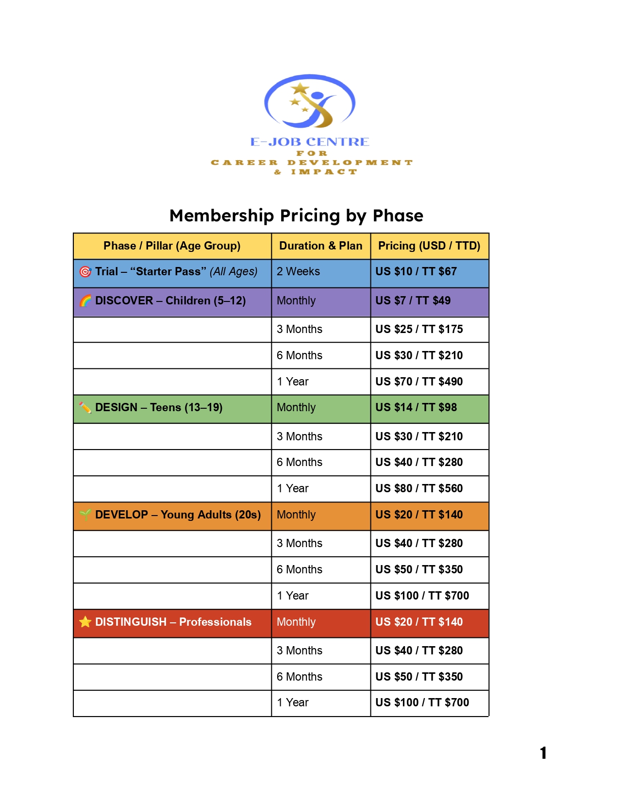 Price: Children: US$7 / TT$49 | Teens: US$14 / TT$98 | Adults (Young Adults, Professionals, Entrepreneurs): US$20 / TT$140